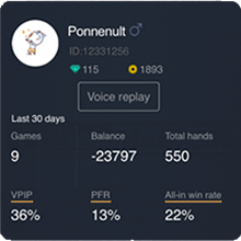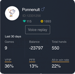 Let’s assume that player A went all-in for 18 times in the last 20 hands, in which player A took down the pot(not being called) 8 times, was called and won 6 times, and was called and lost 4 times. His all-in win rate would be 60%(6/(6+4)), as the 8 times where he took down the pot without showdown would not count towards this statistic.
